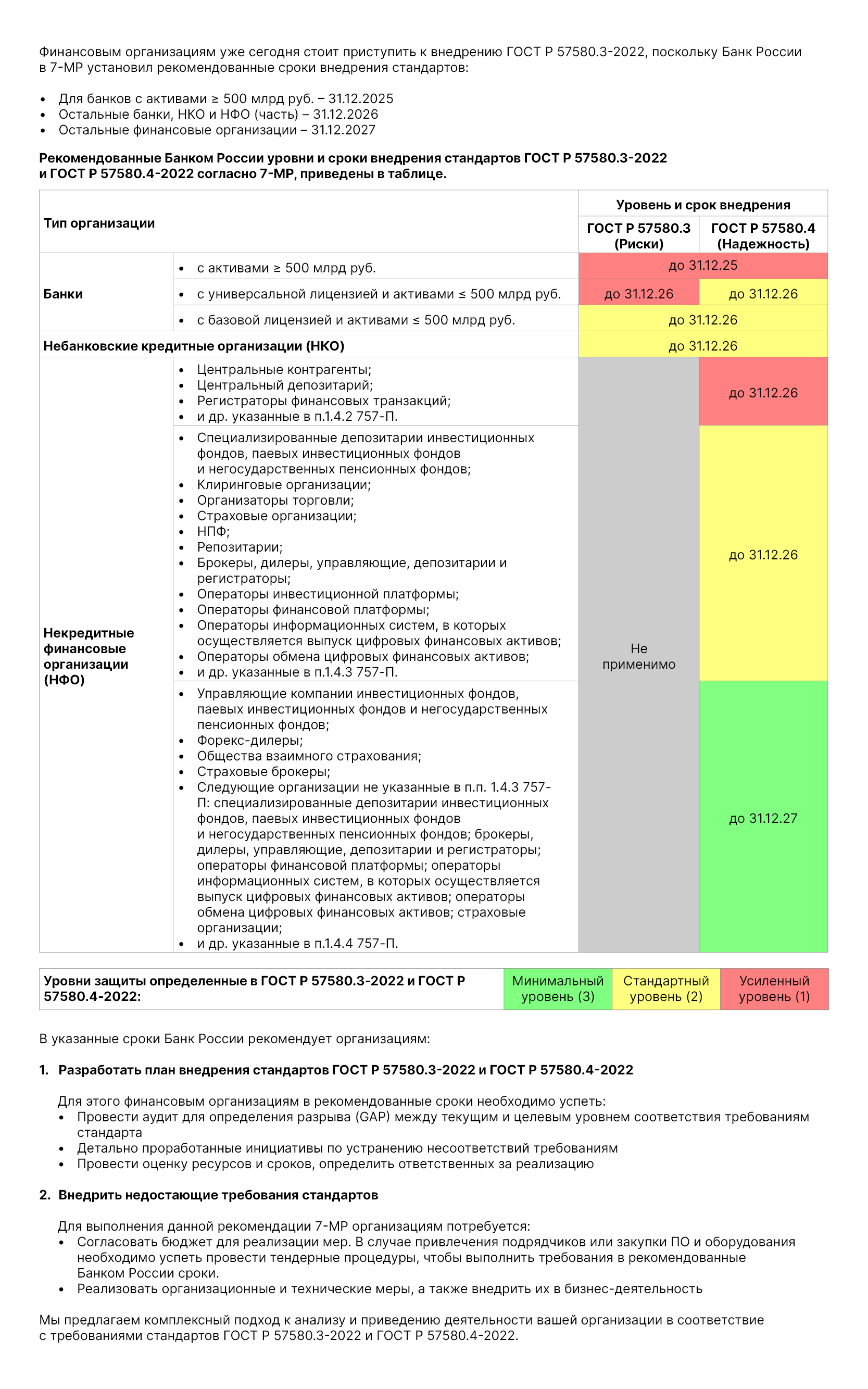 - разработаны общие рекомендации и план внедрения ГОСТ Р 57580.3-2022 в соответствии с 7-МР.